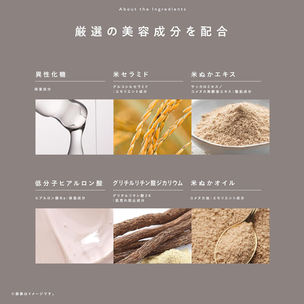 | 全成分 | 水、グリセリン、BG、メチルグルセス-10、ペンチレングリコール、イソペンチルジオール、酒粕エキス、ベタイン、異性化糖、グルコシルセラミド、サッカロミセス/コメヌカ発酵液エキス、ヒアルロン酸Na、グリチルリチン酸2K、フユボダイジュ花エキス、トウキンセンカ花エキス、ヤグルマギク花エキス、ローマカミツレ花エキス、カミツレ花エキス、セイヨウオトギリソウ花/葉/茎エキス、コメヌカ油、ローマカミツレ花油、シクロデキストリン、PEG-32、PPG-26ブテス-26、PEG-40水添ヒマシ油、クエン酸、クエン酸Na、フェノキシエタノール |