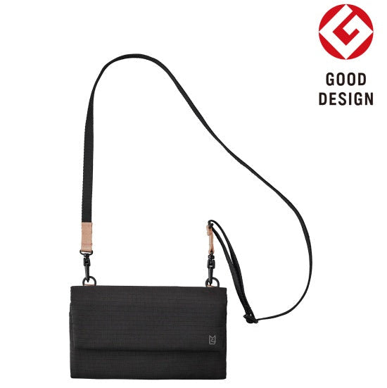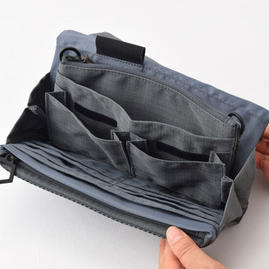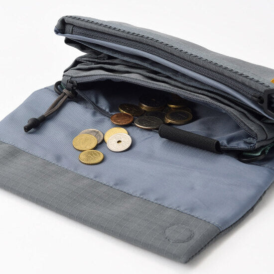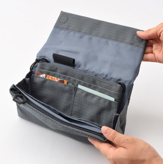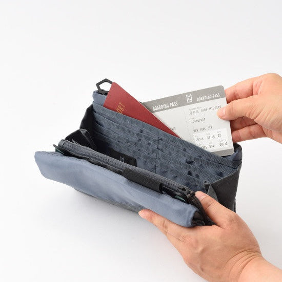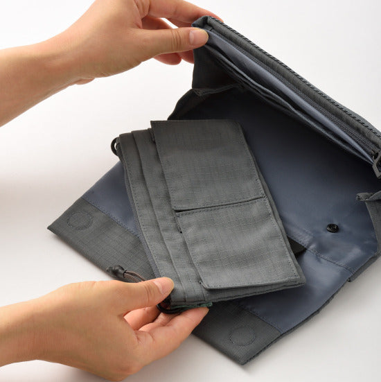 着脱式のポーチを付属し、硬貨やカード、パスポート、筆記具など、貴重品や旅の必需品もすっきり収納可能。