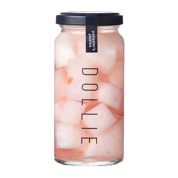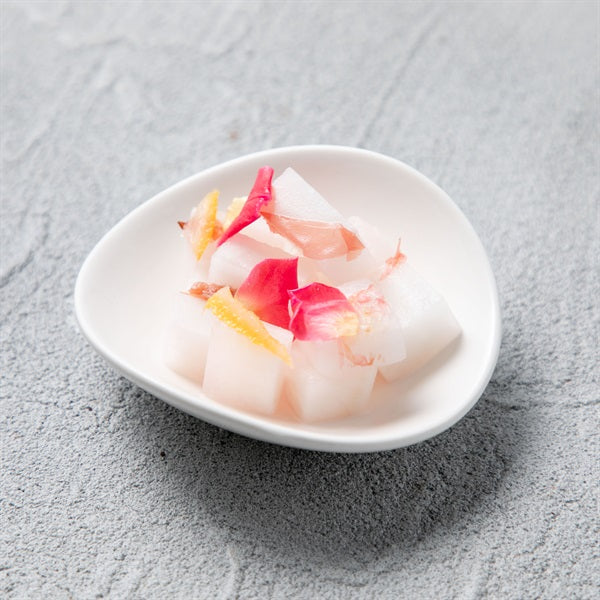 じんわりと味が染み込んだ大根に、梅のやさしい酸味と刻み柚子の爽やかさが重なり、鰹節と昆布が味わいに深みを与えます。薔薇の花びらが瓶の中を華やかに彩り、目でも楽しめるひと品。焼き魚や天ぷらなど、和食との相性も抜群。食卓をやさしく引き立てる、上品で心和むピクルスです。