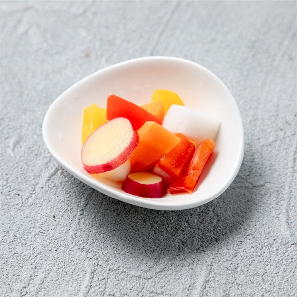 紅芯大根の鮮やかなピンク色がピクルス液に溶け出し、色とりどりの華やかさが食卓を彩ります。国産のズッキーニと大根は柔らかく、優しい食感で、程よい酸味が美味しさを引き立てます。ほんのり香るハーブが、深みのある味わいをプラスし、散りばめられた金箔が贅沢で上品な仕上がりに。サラダやおつまみとして、おもてなしにもぴったりです。