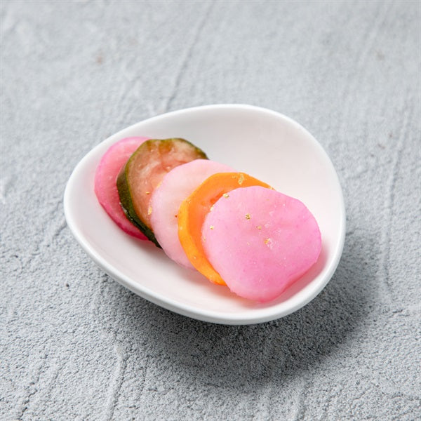 | ズッキーニと大根のラウンドピクルス | ズッキーニ(国産)、紅芯大根、大根、/金箔、漬け原材料[穀物酢(大豆由来)、砂糖、ローリエ、タイム] | 熱量:150kcal、蛋白質:0.9g、脂質:2g、炭水化物:28.5g、食塩相当量:1.2g |