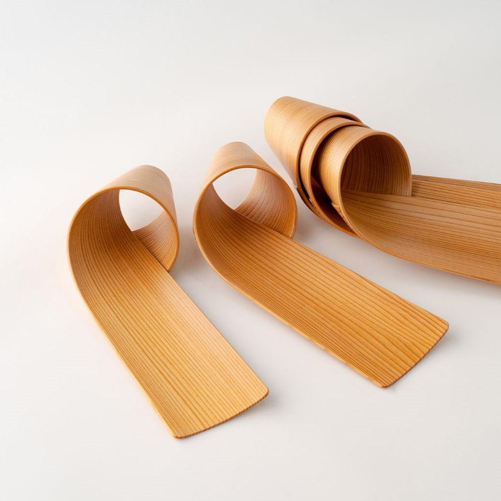 秋田杉を薄く削いだ板を熱湯で煮て、柔らかくしてから筒状に丸め、合わせ目を接着。山桜の皮で縫うようにして固定し底板を密着させて作ります。