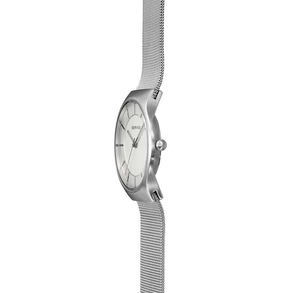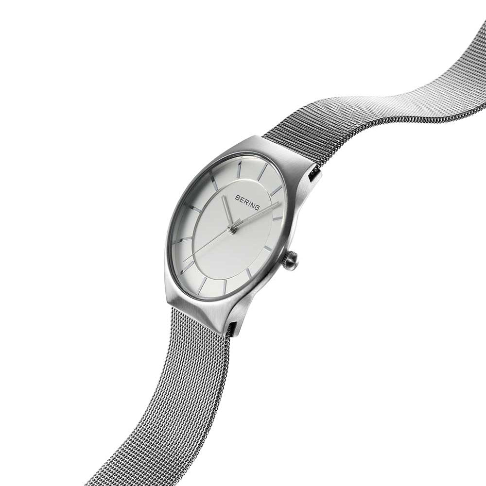 シルバーのケースと文字盤にブラッシュ加工を施し、ソリッド感のある仕上がりに。薄さ7mmのケースは洋服の袖口を邪魔することなく腕に収まります。