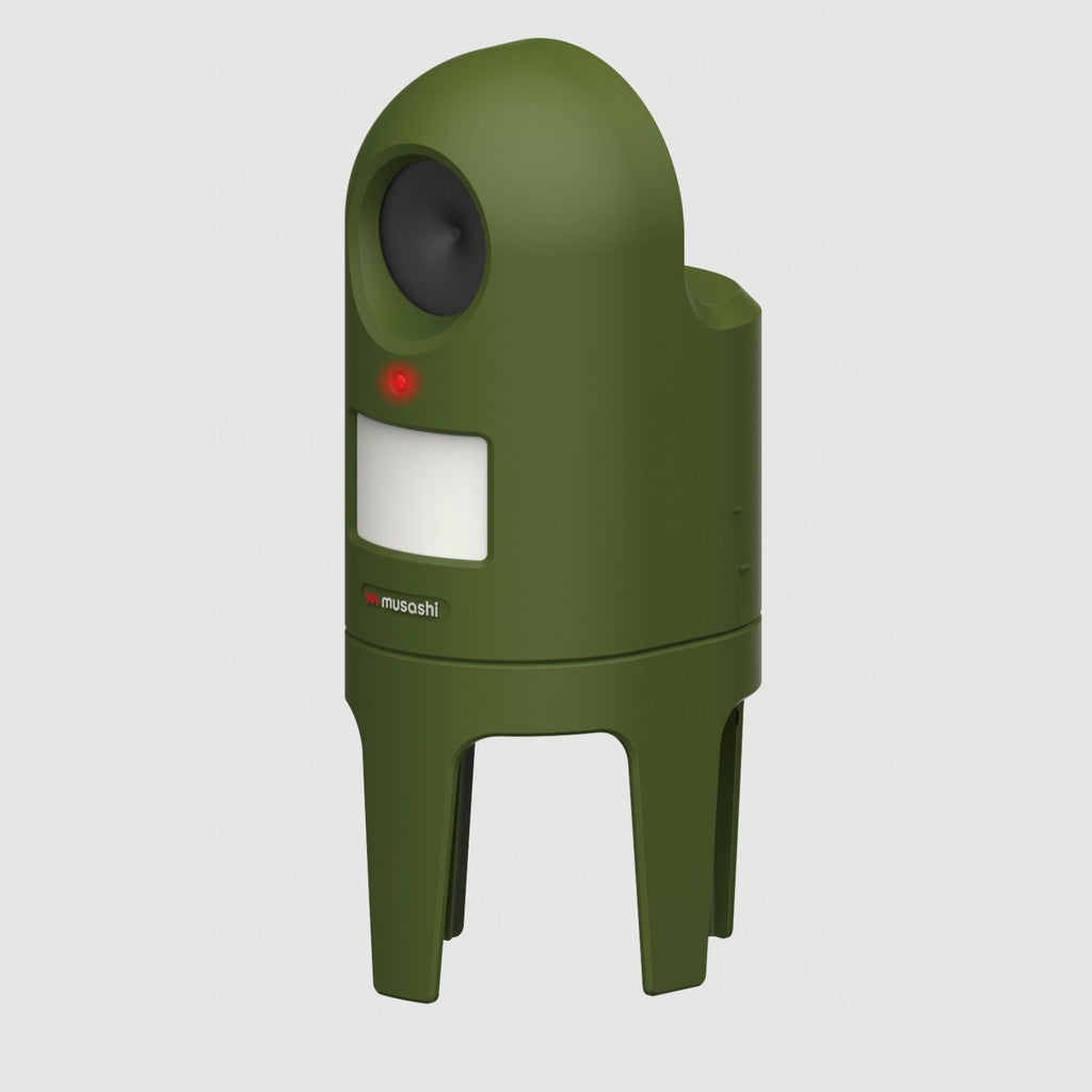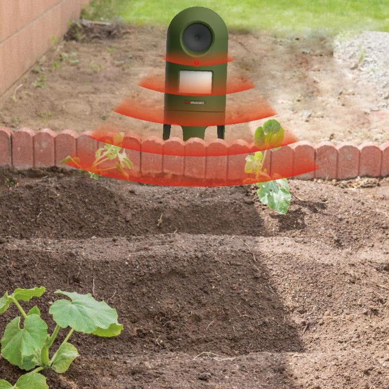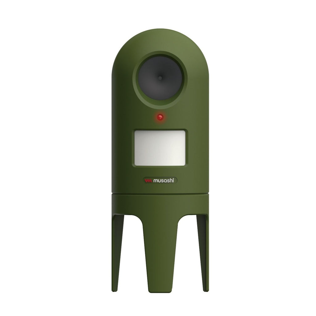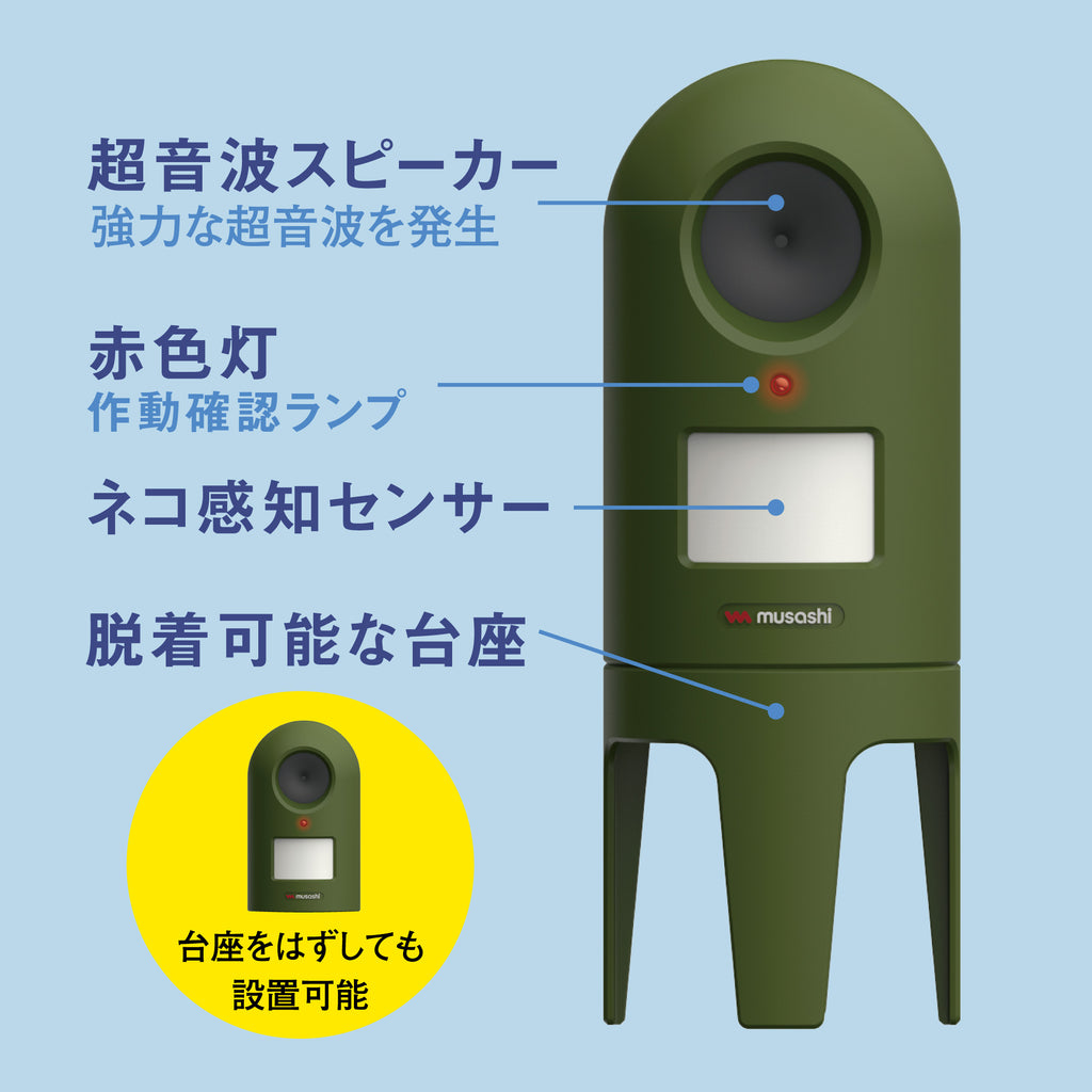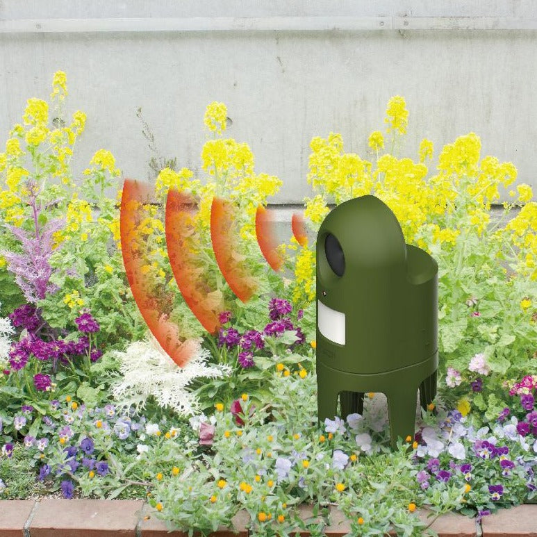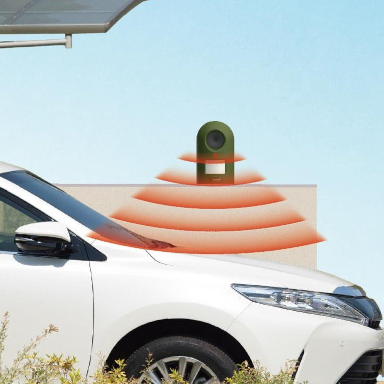 赤外線センサーが猫をキャッチすると、超音波スピーカーが作動して遠ざける。美しい庭やエントランス、駐車場など、どこでも置きやすいようにコンパクトで自然にも建物にもなじむデザインです。