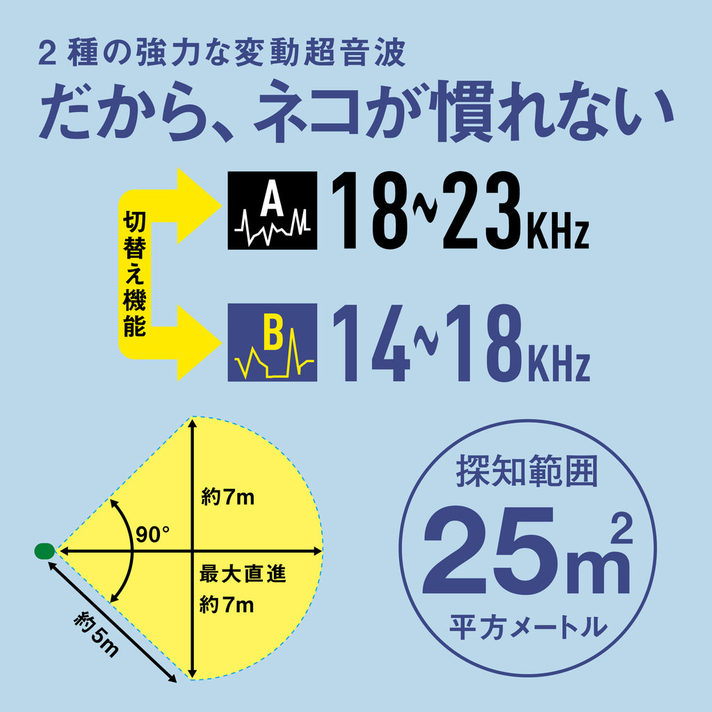 2種類の強力な変動超音波を切り替えられる機能でネコを慣れさせず対策できます。