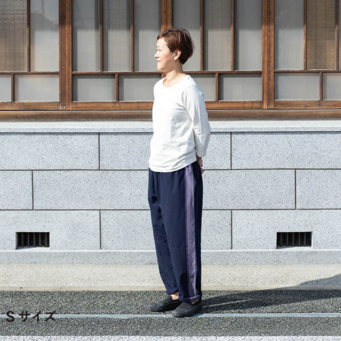 昔ながらのもんぺの形に近いゆったりシルエットのもんぺです。まるでスポーツウェアのトラックパンツのようにサイドにラインが入っています。
