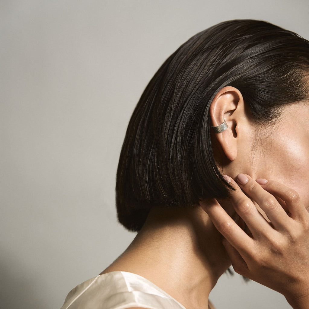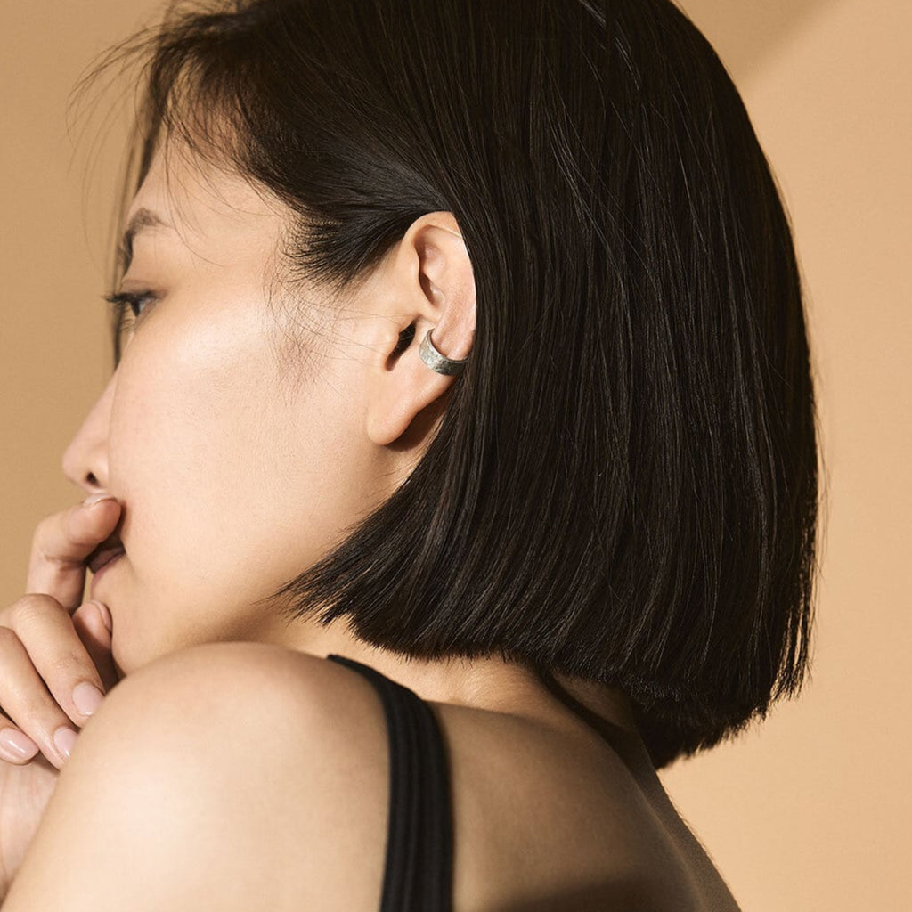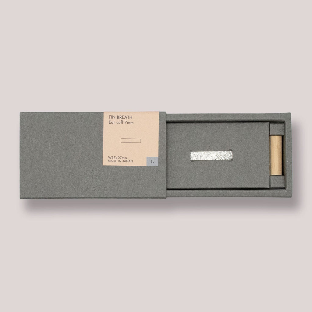 和紙と水彩紙のテクスチャーを表面に施した高純度の錫鋳物(99.99%:フォーナイン)のアクセサリーシリーズ、TIN BREATH(ティンブレス)のイヤカフ。