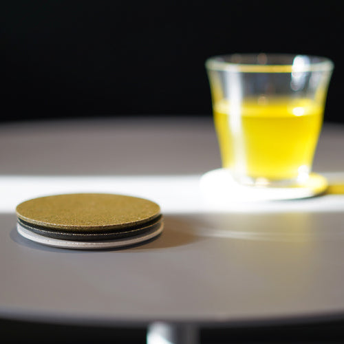 The coaster itself is moderately weighted and has a gentle concave surface on the top to prevent it from sticking to the back of cups. This also has the added benefit of preventing water droplets from falling from the coaster onto the table.